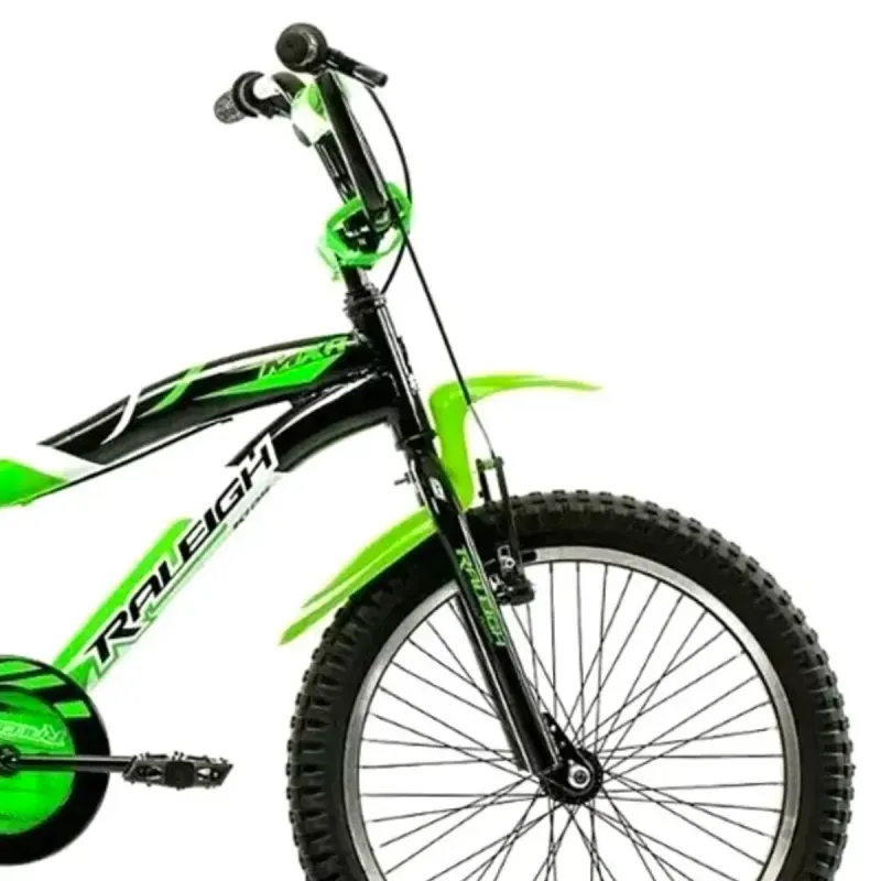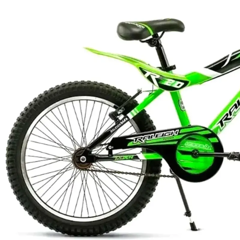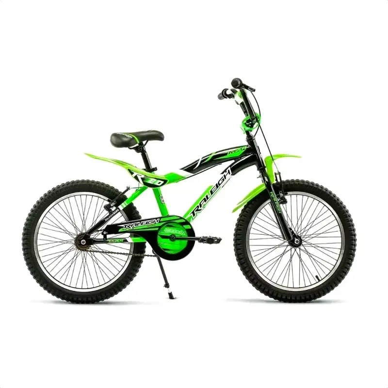 La Bicicleta Raleigh R20 MXR20 Negro Verde es una excelente opción para niños que buscan una bici resistente, segura y con estilo deportivo. Su cuadro de aluminio reforzado con horquilla de acero, junto al rodado 20 pulgadas, ofrece una estructura liviana y firme para paseos urbanos o aventuras en el parque. Equipada con transmisión monovelocidad, frenos V-Brake delanteros y traseros, guardabarros, cubrecadena y rueditas estabilizadoras, esta bici brinda confianza y protección en cada salida. El diseño tipo cross, con manillar elevado y detalles en verde, le da un toque moderno y canchero. Ideal para edades entre 6 y 9 años, combina componentes duraderos y estética llamativa para que cada pedaleada sea una experiencia divertida.
