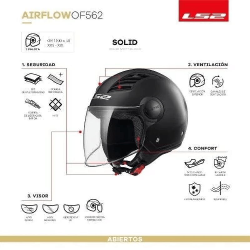 El LS2 562 Airflow Solid es un casco fabricado en HPTT (High Pressure Thermoplastic Technology). Su diseño moderno incorpora dos amplias entradas de aire superiores que proporcionan una excelente ventilación, manteniéndote fresco durante el recorrido. El visor amplio y transparente cuenta con tratamiento antiarañazos y protección UV, asegurando una visión clara y duradera. El interior es desmontable, lavable, transpirable e hipoalergénico, brindando comodidad y facilidad de mantenimiento. Además, el sistema de cierre micrométrico permite un ajuste preciso y seguro.