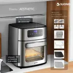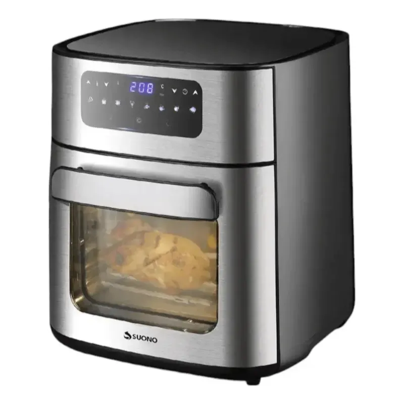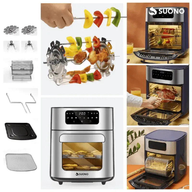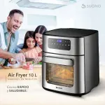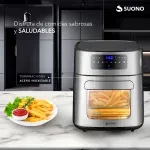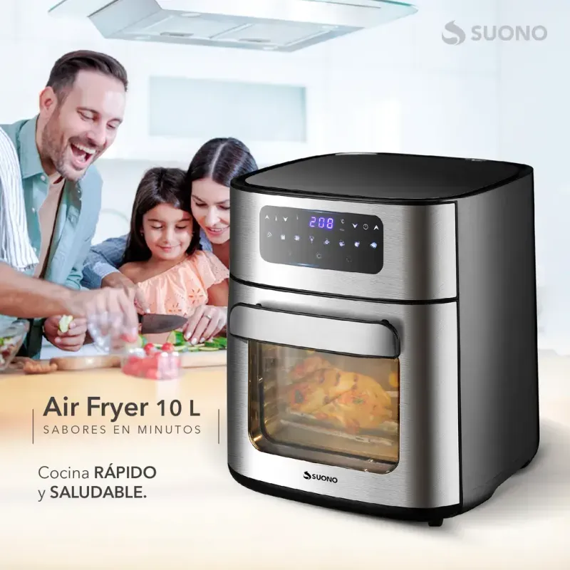 La freidora de aire Suono HOG0188 de 10 litros combina potencia y funcionalidad para ofrecer una experiencia culinaria más saludable y versátil. Con una potencia de 1700W y un rango de temperatura ajustable entre 80°C y 200°C, permite cocinar una amplia variedad de alimentos con poco o ningún aceite, preservando su sabor y textura. Su diseño incluye una ventana transparente que facilita el monitoreo del proceso de cocción sin necesidad de abrir la freidora, manteniendo la temperatura constante y asegurando resultados óptimos. El panel de control digital táctil ofrece 8 programas preconfigurados para preparar desde papas fritas hasta vegetales y carnes. Además, viene equipada con 6 accesorios: bandeja antiadherente, bandeja de rejilla, canasta giratoria, accesorio giratorio para pinchos y brochetas, accesorio giratorio para spiedo y una pinza con gancho para retirar los accesorios giratorios. Todos los accesorios son aptos para lavavajillas, facilitando la limpieza. Con dimensiones de 35 cm de alto y 23 cm de ancho, y un largo de cable de 78 cm, esta freidora es una excelente adición para cualquier cocina que busca combinar salud, sabor y comodidad.